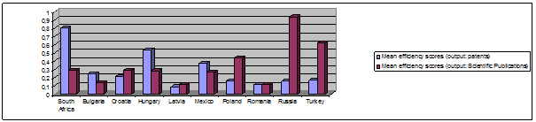 Figure 1 compares the efficiency scores obtained for each of the innovation indicators and shows that some countries such as Turkey, Russia and Poland are much more efficient in terms of scientific publications than patents.