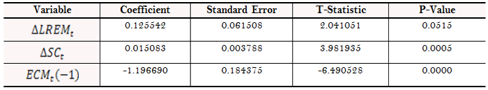 Some researchers [42] are avowing that this value should be between 0 to -1 while other [43] emphasizing that it could be close to -2. So there are no consensus on the range of error correction term but it must be negative and significant for converging towards its long-run equilibrium and existence of relationships. The short-run results presented in the following Table 19 are consistent with the long run results which mean a positive association between dependent and independent variables.