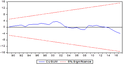 We applied Bounds test again to examine that whether there are long-term relationship exists between the understudy variables or not. The null hypothesis of the bound test states that there is no long-run relationship exists among understudy variables. Following table is showing the results of Bounds test where F-Statistics is greater than the upper and lower Bound critical values which means reject the null hypothesis. In other words, the long run relationship exists among variables (see Table 17).