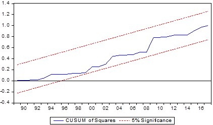 All over again, the CUSUM test is often used by the researchers to examine the stability and structural breaks of the estimated Autoregressive Distributed Lag (ARDL) model. CUSUM and CUSUM squares charts of our estimated model are presented below in Figure 16 and Figure 17. This test is based on a simple rule of thumb which postulating that the blue line should be within the limits of red dotted lines where dotted lines are displaying the upper and lower bounds critical value of the estimated model. Because our estimated model is meeting the stability criteria of the CUSUM test so we can conclude that our estimated ARDL model is stable.