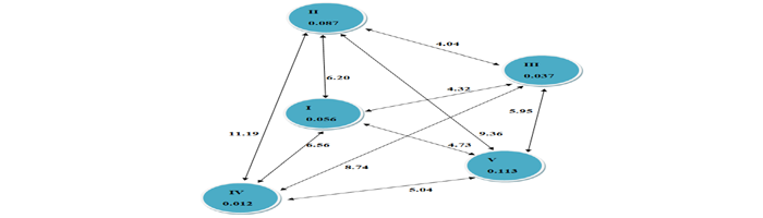 There was much variation among the clusters compared to intra-cluster variations (Figure 1). The maximum intra-cluster distance was found in cluster V (0.113) and the minimum in cluster IV (0.012). The inter-cluster space was highest involving cluster II and IV (11.19) followed by cluster II with V (9.36); cluster III with IV (8.74) and the lowest inter-cluster distance was obtained between cluster II with III (4.04). It is predictable from the exceeding results to facilitate the genotypes belonged to the cluster II with IV and cluster II with V having greater inter cluster distance could be effective for crop improvement program. Mahbub and Shirazy [9] also grouped the pea genotypes into different clusters. Since the genotypes as of diverge cluster may be suggested for enclosure in hybridization program as they are predictable to produce superior segregants [10].