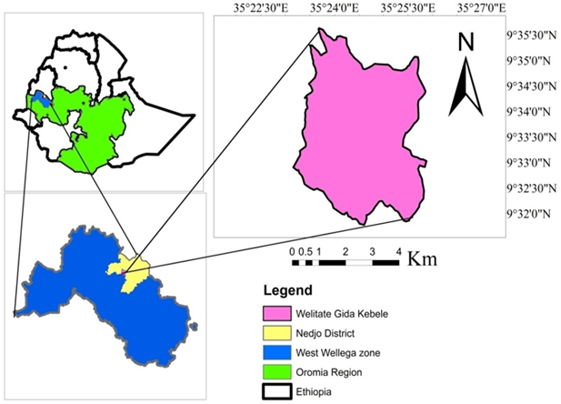 The experiment was conducted for three years (2015-2017) at Nedjo district of Welitate Gida Kebele/Peasant association (smallest unit of governmental administration) in western Ethiopia. The study site is located at 90 33’ 07” N and 350 25’50” E, with an altitude of 1933 meters above sea level Figure 1. The area has a mean annual rainfall of about 1400 mm and experiences a weakly bimodal rainfall pattern extending from March to May and with the effective rain being from June to September. Mean annual temperature varies from a minimum of 18oC and a maximum of 28 oC. The soil type is Nitisols with characteristics deep and good drainage conditions. Acidity and low fertility of soils, and termite infestation are critical constraints of crop production in western corridor of the Ethiopian highlands [12].The farming system is mixed-crop livestock production where teff, finger millet, triticale, maize, tuber crops are dominant crops produced while cattle, sheep, goat, donkey, mule and chicken are major animal species supporting the livelihood of the smallholder farmers.