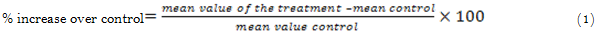 The determination of grain yields was made on each plot at harvest. All 10-plant pods were randomly selected from the middle two rows to determine various yield parameters and injury. The data collected included the number of pods per plant, the number of pods per peduncle, the pod length, the number of seeds per pod, and the weight of the one hundred seeds. The grains obtained after threshing the pods were sun-dried to a moisture content of 12%. Cowpea grains from each plot were weighed and the results were extrapolated in kilograms per hectare (kg / ha) for each treatment. The weight of pods and seeds was determined using a sensitive weighing scale. The formula of Ahmed, et al. [32], Sujatha and Bharpoda [33] was used to calculate the percentage increase in yield over control.