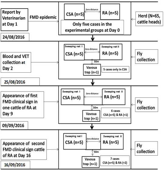 Stomoxys spp. were trapped beside a herd around the Ngaoundere cattle market where this herd consisted of cattle showing FMD clinical signs (foot/mouth lesions and lameness that started one day before our arrival for this study as reported by the veterinarian who regularly check the general health of cattle in the herd). Capture was made using two different methods notably trapping with odor-baited (Octenol) Vavoua trap [9] and a modified heavy-duty sweep net, consisting of a white mosquito net, light aluminum circular (with diameter of 35cm) handle and bag depth of 75cm. The Vavoua trap was pitched at 50m away from the experimental cattle. Octenol was placed inside a sterile urine tube and placed at the foot of the Vavoua trap. Traps were exposed from 6:00 am to 6:00 pm. The Vavoua trap cages were emptied every evening (6:00pm). Trap and animal total exposure duration was 21 days because whenever an animal in any of the infected and non-infected group showed early clinical signs, flies were trapped for at least five days while waiting for the appearance of fresh FMD cases. In this study we started with five clinical case animals (CSA, n=5) and randomly selected animals (RA, n=5) that represented the non-clinical sign group with collection from both groups carried out using sweep nets (n=2) and Vavoua trap (n=1) pitched at 50m from both exposed cattle groups. Follow up days and collection of blood, VET and flies were carried out during a primary FMD outbreak in Ngaoundere as shown in Figure 1.