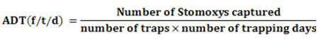 Trap Apparent Density (ADT), defined as Stomoxyinae caught per trap per day (s/t/d) and mathematically expressed as: