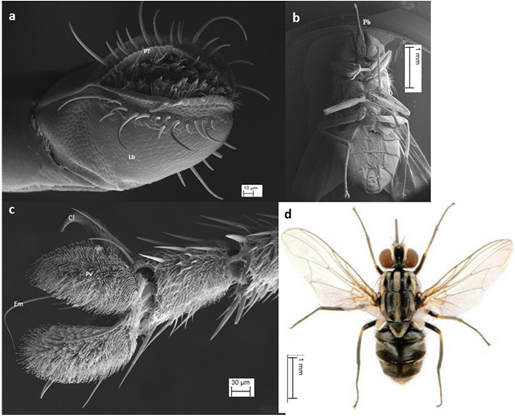 A) SEM of S. n. niger proboscis- PT: prestomal teeths; Lb: Labellae; Pb: Proboscis, where the labium forms the proboscis and the labellae are transformed into a penetrating organ, which quickly pierces the skin during the blood meal. B) SEM of S. n. niger from the ventral side C) SEM of S. n. niger leg- Cl: Claws, Pv: Pulvilus hairs; Em: Empodium or sensory body: FMDV particles (size 0.03μm) presumably attach to the hairs of the pulvilus, when the fly lands on infected body parts. D) Macroscopy of adult S. n. niger (7mm).
