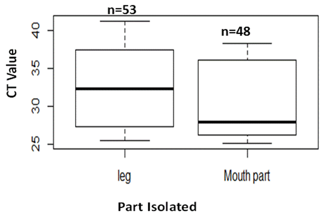 The ct value plot of the various anatomical parts of S. n. niger isolated revealed that legs had a higher FMD viral amount than mouthparts even though their mean differences were not statistically significant Figure 4. However, mouth parts possessed the highest amounts of FMDV as compared to legs.