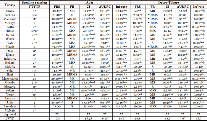 In the study, seventeen durum wheat cultivars were resistant and three cultivars were susceptible to stem rust race TTTTF at the seedling stage. Cultivar Mettaya and Oda were supposed to confer major gene resistance. Correspondingly, at Adet Bkalcha, Lelisso, Ilani, Yerer and Bichena identified as having high level of field resistance.