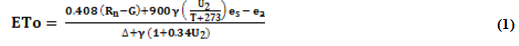 Where, ETo is the reference evapotranspiration (mm d−1); Δ is the slope of the saturation vapor pressure function (kPa (°C)−1 ); Rn is the net radiation (MJ m−2 day−1); G is the soil heat flux density (MJ m−2 day−1); T is the mean air temperature (°C); U2 is the average 24-hour wind speed at 2-meter height (m s−1); (es-ea) is the vapor pressure deficit (kPa); and γ is the psychometric constant (kPa (°C)−1). The computation of all data required for the calculation of the ET0 followed the equation given by Allen, et al. [11].