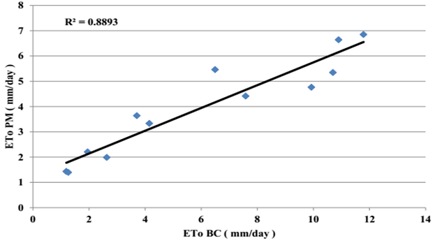 When the Blaney-Criddle ETo equation is compared with the standard FA0-56 PM ETo equation, it overestimated FAO-56 PM ETo equation by 34.34% at Lahore weather station as shown in Table 2 and Figure 2.