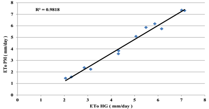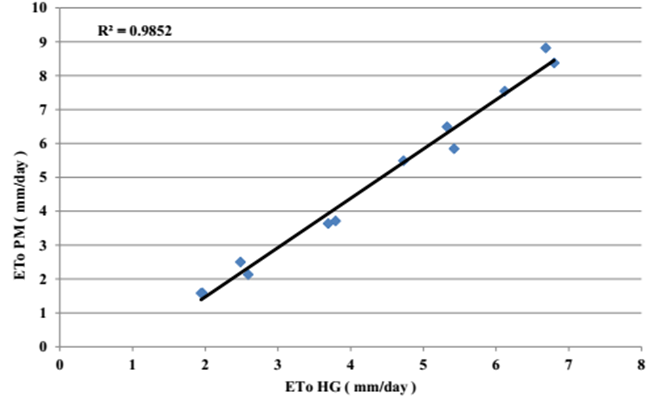 The Hargreaves (HG) ETo equation and Blaney-Criddle (BC) ETo equation compared with the standard Penman-Monteith (FAO-56 PM) ETo equation for monthly estimation of ETo in semi-arid climatic conditions of Lahore, Faisalabad and Peshawar, Pakistan. The Hargreaves (HG) ETo equation overestimated FAO-56 PM ETo equation by 7.91% at Lahore weather station as shown in Figure 1 and in Table 2.