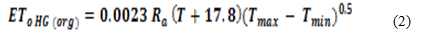 ETo HG (org) = reference evapotranspiration (mm/day) by original ETo equation before modification ; T, Tmax and Tmin= average, maximum and minimum air temperature (o C) respectively.