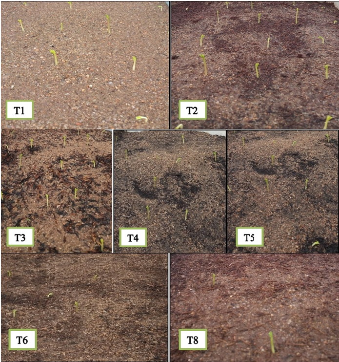 Figure-1. Emergence on the fifth day after sowing as a function of treatments: T1- sand, T2- sand + coconut fiber, T3- Sand + rice husk, T4- sand + bovine manure, T5- sand + pine powder, T6- sand + chicken manure and T8- sand + quail litter. Source: Ana Luíza de Melo Lucena, Areia-PB 03/01/2020.