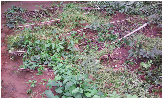 The field study was carried out on the grounds of the Agulu slaughterhouse. Agulu, which falls within the Awka Capital Territory, is one of the most populous towns in Anambra State, Nigeria. It lies within latitudes 6.04 °N and 6.09 °N and longitudes 7.00 °E and 7.03 °E. Average annual rainfall in the area is 1923mm, with a maximum rainfall of 35.7oC in February and a minimum of 20.4oC in January. The study was carried out during the dry season (November to January) to minimize nutrient leaching due to rainwater. Effluent was collected from an experimental constructed wetland for secondary treatment of slaughterhouse effluent. A complete randomized design was employed for the study, with six replications. The Telfairia occidentalis were planted in 12 beds (6 beds per treatment) measuring 1m wide, 3m long and 0.2m high, with a total of 15 plants per bed, as shown in Figure 1. The soil in the experimental area was classified as sandy clay. The beds received about 2mm of secondary treated effluent and tap water per day. The plants were harvested in January, after 8 weeks of planting and oven dried. The above ground dry biomass yield was the evaluated. Stem thickness, leaf length, leaf width, height and number of branches were also measured. The differences in the means of the two treatments were analyzed using one-way ANOVA with significant level set at p< 0.05. The physicochemical properties of the effluent and tap water were measured, while the influent and effluent organic (BOD) and nutrient (NO3-N) load of the constructed wetland were measured. For influent and effluent sampling, grab samples were collected using 500 ml plastic containers washed in non-ionic detergent and rinsed with tap water prior to usage. The samples were immediately transported to the laboratory in an ice block filled cooler and stored in the refrigerator at about 4°C prior to analysis. Biochemical oxygen demand (BOD), total suspended Solids (TSS), total dissolved solids (TDS) and ammonium nitrogen (NH4-N) were analyzed according to standard methods [13]. Nitrate nitrogen (NO3-N) and orthophosphate (PO43-) were analyzed using the US EPA approved general purpose field test kits by Hach Company [14].