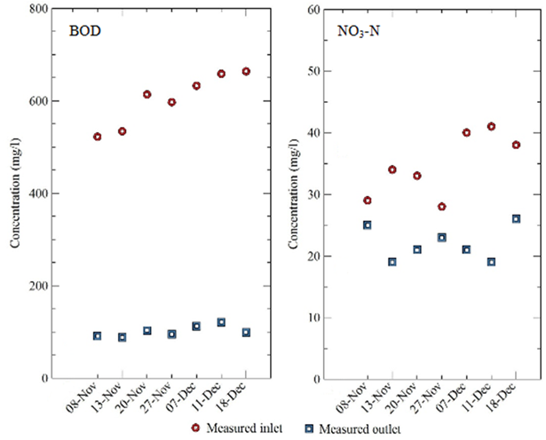 Figure-2. BOD and NO3-N concentrations measured at the inlet and outlet of the wetland.