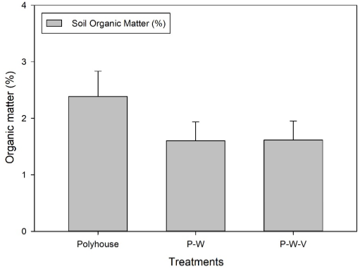 Soil organic matters have direct role on soil fertility as its oxidation in soil can provide nutrition like nitrogen, phosphorus and sulphur to plants [28, 29]. Therefore, knowledge of soil organic matter is essential for understanding soil fertility. An accumulation of organic matter on the soil was significantly (p<0.05) higher in vegetable cultivation under polyhouse (2.37 ± 0.13) compared to other two cropping systems Table 2. However, cultivation of vegetables in the paddy wheat cropping system did not improve the organic matter contents Figure 3. The mean organic matter reported in our study were less compared to previous study [28]. Organic matter is rapidly lost when input is reduced [30]. Therefore, the difference in organic matter in various site can be due to difference in input rate.