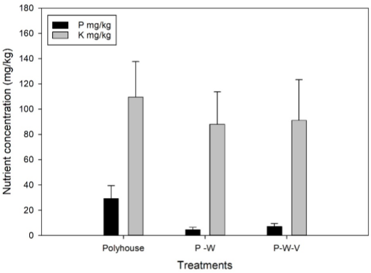 Phosphorus (P) and potassium (K) are important nutrient required for plant growth. Available soil P and K can be directly used by plants which promotes soil fertility and plants growth [33]. Our findings showed that cultivation under tunnel increased phosphorus (29.15 mg kg-1) and potassium (108.88 mg kg-1) content of soil Table 2. On the other hand, paddy-wheat cropping system shows least accumulation of phosphorus (4.95 mg kg-1) and potassium (90.02 mg kg-1), while addition of vegetable in paddy wheat cropping system however have positive impact on accumulation of phosphorus (6.97 mg kg-1) and potassium (91.04 mg kg-1) Figure 4. The available soil phosphorus and potassium reported in our study are similar with previous study [34].