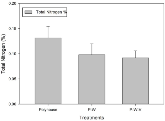 Nitrogen is one of the major nutrients required for proper growth and development of plants, especially food crops and are closely related to economy of crop production. Soil nitrogen is important for leaf growth and promote photosynthesis [37]. Therefore, understanding the nitrogen content of the agricultural soil is important for crop growth and productivity. In this study, we found that the percentage of nitrogen content in the soil shows significant (p<0.05) differences among three treatments Table 2. The highest soil nitrogen was found in polyhouse (0.13%) followed by paddy-wheat cultivation (0.097%) and paddy-wheat-vegetable farming (0.091%) Figure 5. Our findings are consistence with Panday, et al. [25]; Khadka, et al. [38]; Shrestha [39] who reported that the continuous application of nitrogenous based fertilizer might be the explanatory factor for high total nitrogen in the soil of study sites. While difference in the nitrogen content among ecosystems could be due to difference in management practices.