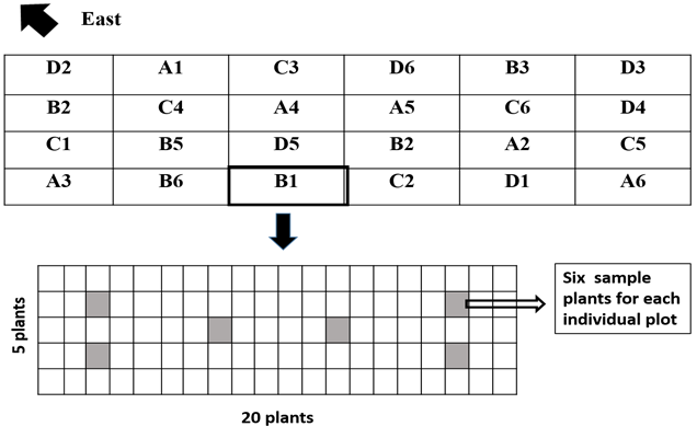 Figure-3. Randomized plot of treatments and sampling plants in each plot of field experiment.