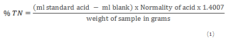 The total nitrogen (TN) content was determined using the micro Kjeldahl method; which is characterized by the following key steps: Kjeldahl digestion, distillation, and titration of NH3-N [30]. Two grams of each organic fertilizer were measured and mixed with sulphuric acid and Kjeldahl tablet catalyst (Merck, South Africa) in a Kjeldahl flask; the resulting mixture was digested at 400°C for at least 30 minutes until a clear solution is formed [31]. The flask was removed from the heater, cool down to room temperature, and then transferred into a distillation unit in admixture with 50 ml of water. The distillation was done in about 30 – 40 minutes [31]. A boric acid solution containing methyl red and bromocrescyl green indicator (Merck, South Africa) was used as the absorbing solution to capture the dissolved ammonia gas. Afterward, Sodium hydroxide was used to neutralize the reaction process and the resulting greenish boric acid solution was then titrated against 0.1 M HCl until a permanent light pink color appeared. Finally, the percentage total nitrogen was calculated using the titer values for all the treatments in Equation 1 [32].