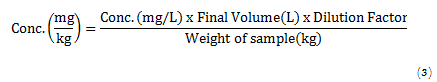 Using reagent grade chemicals, the concentrations of K, Cd, Cu, Pb, Ni, Zn, Cr, Fe, As, Selenium (Se), Aluminum (Al), Manganese (Mn), Barium (Ba), Cobalt (Co), Silver (Ag) and Vanadium (V) in the samples were analyzed by using the principle of microwave atomic emission spectrometry (MP-AES). The numerous benefits and the suitability of MP-AES for metal analysis have been rigorously reviewed by Balaram [35]. According to Gong, et al. [20] the chemical analysis of standard samples, duplicate samples, and method blanks was equally carried out to ensure quality control and assurance. Prior to chemical analysis, 1 gram (dry weight) of each sample, in admixture with 4 ml of 50% nitric acid (HNO3) and 10ml of 20% Hydrochloric acid (HCl), was prepared. Following the SW-846 method 3050B established by the United States Environmental Protection Agency (USEPA), digestion of the mixture was carried out on a hotplate in a fume hood with a temperature not exceeding 900C for about an hour. The final volume of the digest was approximately 5ml for each sample. The digest was then filtered and diluted to 50ml using ultra-pure deionized water. After the MP-AES analysis, data output in part per million (ppm or mg/L) was converted to mg/kg using Equation 3 [36]. For K, its concentration, in mg/kg, was first converted to a percentage and then to percentage total potash (TPO) by multiplying the percentage K content with 1.2 [37].