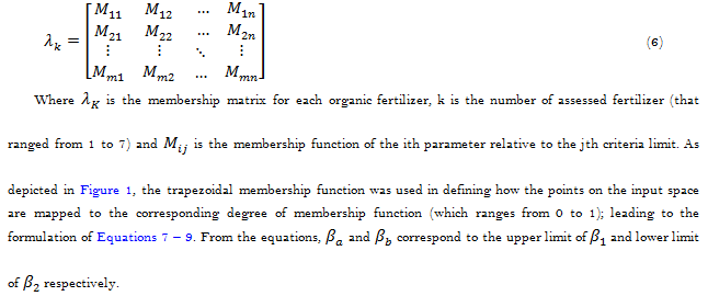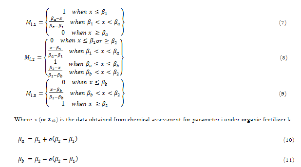 This involves the determination of the degree of membership of an assessed parameter relative to the chosen regulatory criteria limits for each organic fertilizer; these values are then subsequently aggregated and arranged into a fuzzy matrix that can be evaluated with fuzzy reasoning technique. This variable can be defined using Equation 6: