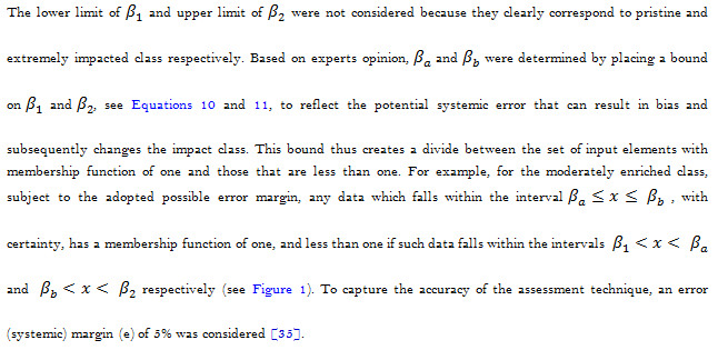 The introduction of these limits is as a result of the need to clearly define the fuzzy boundary near the regulatory limits, as well as to fully characterize the trapezoidal membership functions. The fuzzy boundary is considered as the region in which the pollution class changes due to a small variation in the measured data [39].