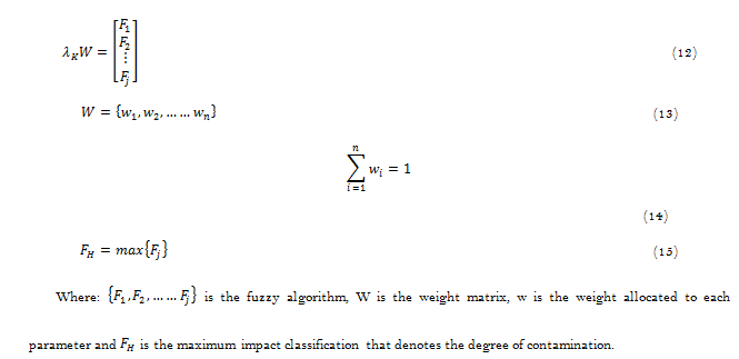 This is the product of the fuzzy membership matrix and an established weight matrix. The weight matrix is obtained by assigning weight to each parameter of interest based on its relative contribution to the level of heavy metal contamination. The fuzzy algorithm is expressed by Equations 12 – 15: