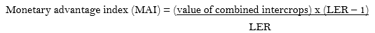 The monetary advantage index (MAI) is an important index in determining the economic viability of intercropping. It was calculated using the formula: