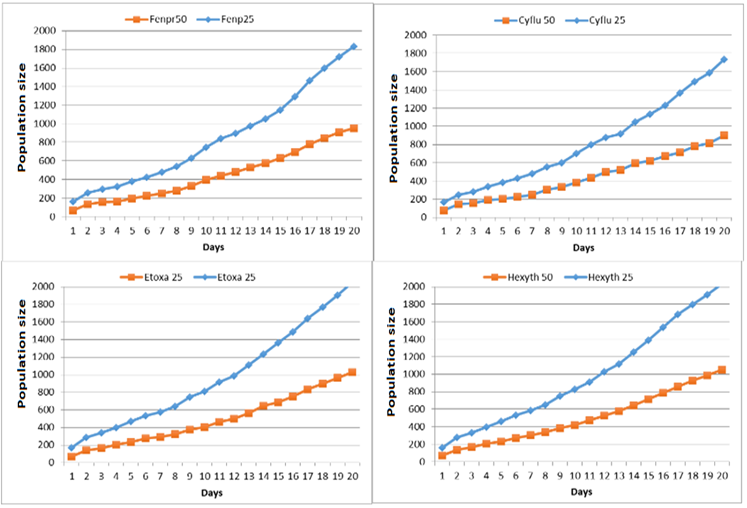 The experimental procedure of ri estimation procedures by using the plant leaf discs sprayed by the LC25 and LC50 separately that defined from the initial bioassay Table 2. In this experiment, the daily offspring assessed until 10 days following initial exposure (Long-term or sublethal effects). About 100 P. persimilis adult females and placed in an eggplant leaf discs were tested per replicate (10 leave), and left for 24 h (at 25°C room temperature), to get around 300 ovipositing eggs. After emergence, 10 adult female of P.persimilis was transfer from each leaf disc to a new one infested with T.urticae, infestation ratio was (1:1) and sprayed by acaricide concentrations using hand atomizer, and kept 10 days after treatment under laboratory conditions at 25±2°C and 14 h photoperiod. Control were sprayed by water only. Five replicates were performed per acaricide. Some male was added to each to fertilize the females. Small amounts of pollen from castor bean flowers R.communis were daily provided to feed the predators. The number of eggs, immatures and adults of P.persimilis counted daily until ten days, and the viability of eggs were checked.
