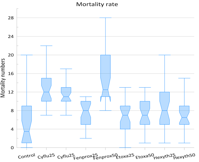 Hypothesis testing (the maximum allowable probability of making a type I error) is a statistical procedure and calculation completed to analyze the data to finish analysis of variance accomplishment, to determine if the acaricide concentration as factor has a statistically significant effect on the response variable (Table 6).