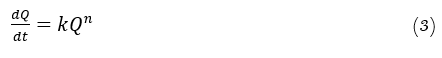 Where Q is the quality factor measured at a given time (t), k is the temperature-dependent kinetic rate constant (T), n is the reaction order, and dQ/dt is the rate of change of Q over time (t).