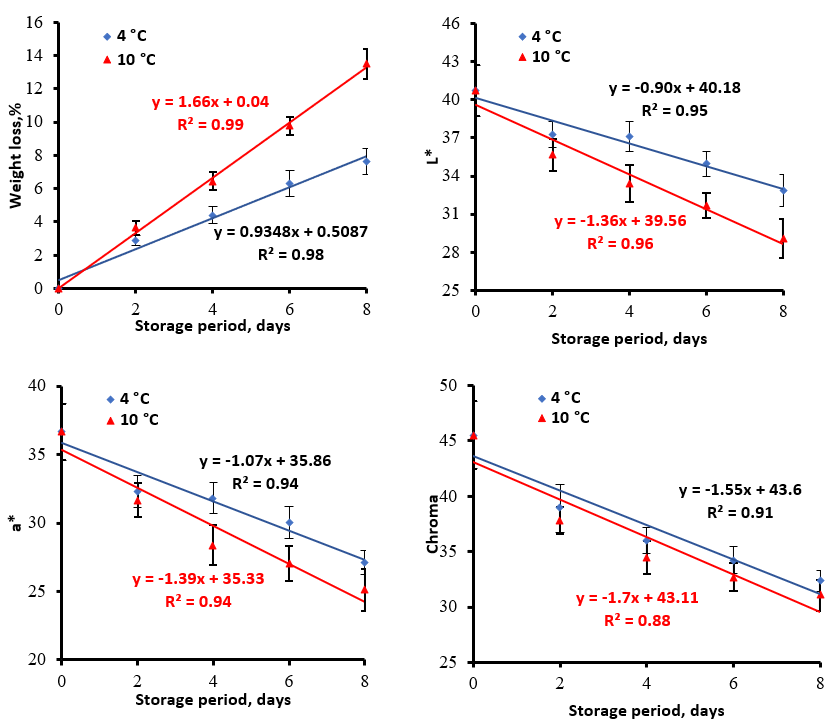 Figure 1. Quality changes (weight loss, L*, a* and Chroma) of strawberry fruits during 8 days of storage at 4℃ and 10℃.