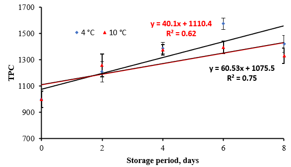 Storage temperature had little to no influence on the TPC value significantly (p > 0.05) (Figure 3). This prevented it from modeling the TPC in combination with storage at 4 and 10°C. The highest increases were measured when fruits were stored at 4°C (1574.58 mg.kg-1 fresh matter), but TPC levels can rise at any time throughout storage. In general, the onset of ripening was associated with an increase in TPC, particularly with rise in the activity of the phenolic compound-producing enzyme phenylalanine ammonia-lyase (PAL) [13].