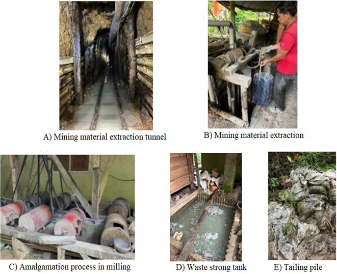 The mine material was extracted from a depth of 56 meters, then the gold was extracted using a grinding machine (drum) by amalgamation using mercury (Hg) as illustrated in Figure 4. After that, the tailing was deposited in a pond or sump under the grinding machine for 1 month and the tailing were stored in a stockpile.
