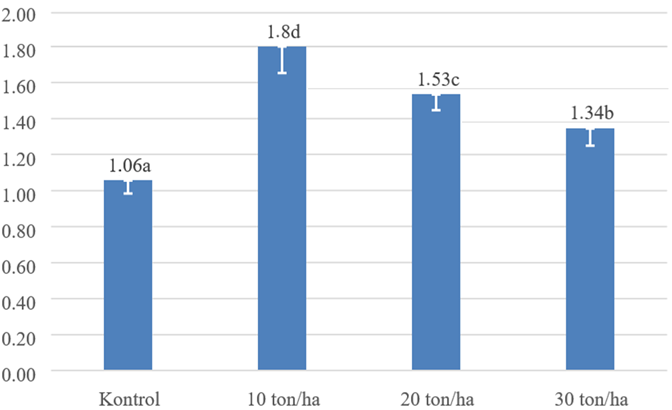 The results of Duncan's post hoc test in Figure 6 indicate that the application of CM has a significant effect on the wet weight of water spinach plants. The wet weight in the treatment of 10 t ha-1 is significantly different from the wet weight without CM (control), as it is 69,81% higher.