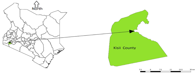 The study was carried out at Kenya Agricultural Livestock and Research Organisation farm (KALRO) located in Kisii County (Figure 1), which is characterized by very small landholdings, ranging from 0.2 Ha to 2.1 Ha (0.5 acres-5.18 acres) of land. The region enjoys a highland climate found in latitude 0o 40’ 0.00’’ N and longitude 34o 45’ 0.00’’ E. Kumba [12] the area receives rainfall all year round, thanks to its positioning in the Lake Victoria basin and the densely foliaged Kisii highlands [13].