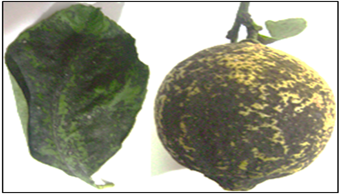 Figure-1. Symptoms of sooty mold on leaf and fruit lemon