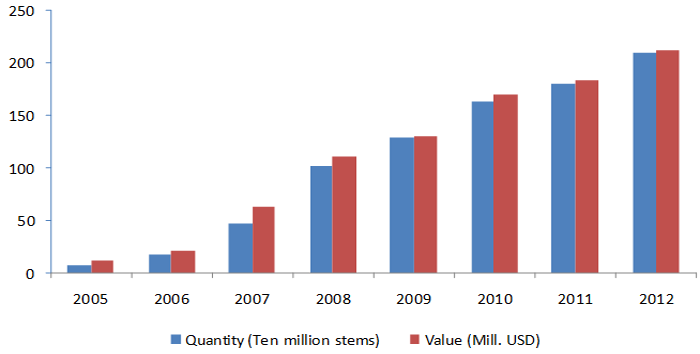 Although the sector is new, the flower production is increased both in volume and area coverage. According to Ethiopian Horticulture Development Agency (EHDA) [4] the number of cut flower stems produced and exported to the world market increased from 83 million in 2005 to over 2102 million stems in 2012. Accordingly, the export earnings of the sector increased from US $ 12.6 to over US $ 212.56 million in the same period (Figure 3) that makes the sector the fourth foreign currency generator of the country next to coffee, oilseeds and cereals [4]. Thus, the export oriented floriculture sector is now an important integral part of the country`s efforts to expand and diversify export products and raise export earnings [6, 9, 10].