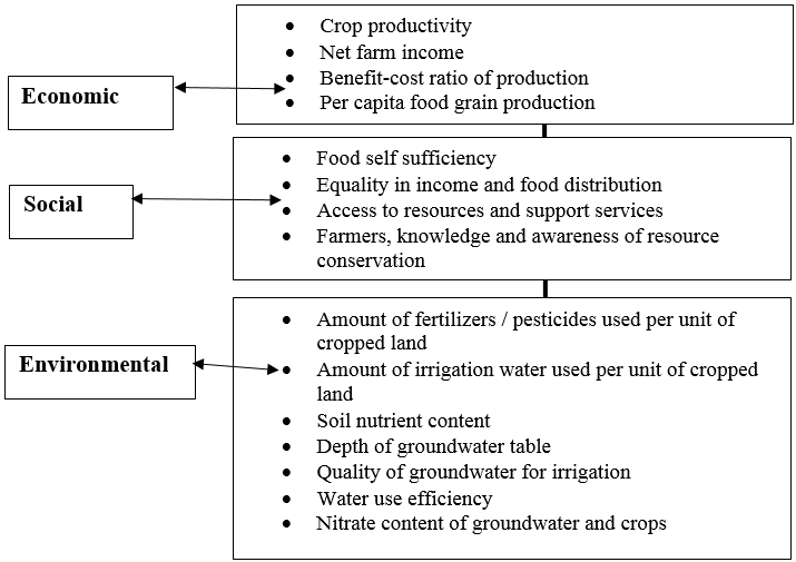 Zhen and Routray (2003) has proposed operational indicators (Figure 1) that can measure agricultural sustainability based on the three components; economic, social and environmental and there are some indicators mentioned under these components. The three components along with the indicators are summarized below-