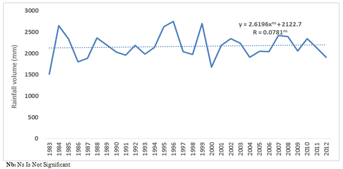 Figure 1 shows the trend of rainfall volume from 1983 to 2012. Aggregate volume of rainfall in the area shows that there is high inter-annual variability in the volume of rainfall from 1983 to 2012 which also resulted to a very low and insignificant correlation (0.0781) between rainfall volume and time. The trend line in figure 1 shows that volume of rainfall in the area has a positive trend coefficient. This indicates that rainfall volume in the area experienced slightly increasing but insignificant trend. This result is substantiated with the findings of Babatunde et al. (2011); Onyeneke and Mmagu (2014); Onyeneke and Madukwe (2010); Nwosu et al. (2014) who assert that aggregate rainfall in the rainforest and coastal regions of Nigeria has not changed significantly.