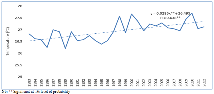 Data on temperature from 1983-2012 shows an increasing and statistically significant trend (Figure 3). The coefficient of correlation of temperature and time is 63.8% and is statistically significant implying that temperature has significant positive relationship with time. The trend coefficient is 0.03 implying that temperature is likely to increase by 0.30C every ten years. Therefore, time is a major determinant for temperature changes. This means that global warming is real and significant in Abia State, Nigeria. This is in line with the findings of Onyeneke and Mmagu (2014); Chidiebere-Mark et al. (2014); Nwajiuba and Onyeneke (2010); Nwaiwu et al. (2013); Nwaiwu et al. (2013); Okorie et al. (2012); Babatunde et al. (2011); WACDI (Women and Children Development Initiative) (2011); Nwajiuba and Onyeneke (2010) who observed that the evidence of variation in the climate of rainforest zone of Nigeria is seen on steady increase in surface temperature.