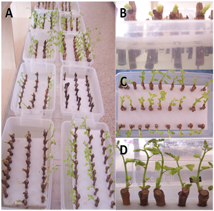 Figure-1. Cutting samples from each cultivar at containers fixed with styrofoam. Bud break stages (A), basal end callusing stages in water (B), sprouting (shooting) stages (C), and final investigating stages (D).