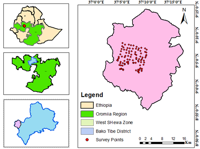 Bako Tibe district was one of those districts with the highest maize production and largest area under maize in western Oromia (West Shoa Zone) with a total maize area of 32,562 hectare and production of 2,027,207 quintals (source: Bako Tibe District Bureau of Agriculture, data av. of three years). Thus, the district was selected as a priority district for conducting the agronomic panel survey under the Taking Maize Agronomy to Scale in Africa (TAMASA) Project. The district is located in Oromia Regional State at road distance of 250 km from the capital city of Ethiopia, Addis Ababa to the western direction Figure 1. Geographically the district is situated between 9°12'35" - 9°7’30’’N and 37°58’25’’ - 37 o13’40’’E. The altitudes of the studied farms ranged between 1593-1847 meter above sea level (m.a.s.l) with average altitude of 1670 m.a.s.l, which are all in the mid altitude. The dominant soil type is nitisol characterized as very strongly to strongly acidic.