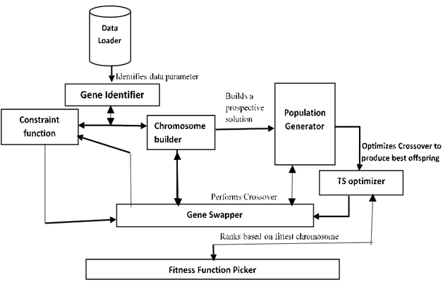 The CB helps to build prospective solutions by combining distinct genes already validated by the CF. The outcome of this component serves as input to the population generator. The Population generator helps to generate population of chromosomes by bonding several output of CB to produce a single generation. Next is the TS Optimizer, which makes use of Tabu search algorithm to produce optimized numbers of best crossover parent, offspring and mutation (parent or offspring) to yield best fit chromosomes. Furthermore, it helps the Gene Swapper to make the best move during gene swapping process within the chromosomes. The Gene Swapper helps to achieve the process of crossover and also produce the right choice of coded gene weight which will swap or replace existing gene with a chromosome validated by the CF. Lastly, the FFP is designed to select best fit chromosomes during population generation and production of final solution. The FFP depends on the TS-optimizer for accurate and best output. The proposed system architecture and flowchart are shown in Figures 1 and Figures 2 respectively.