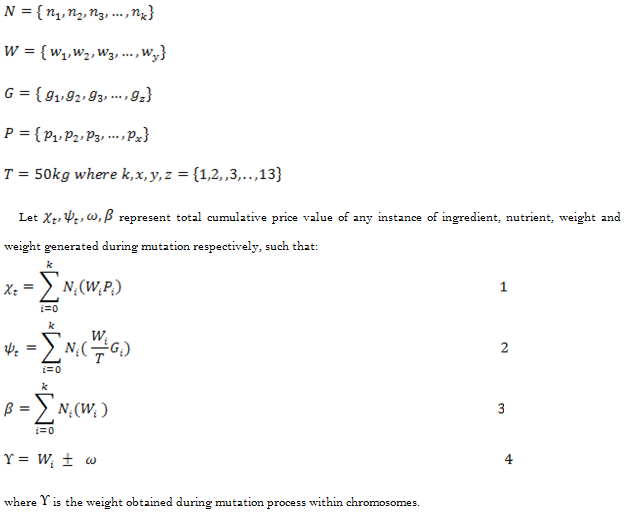 The genetic algorithm constraint initialization phase is the phase where all constraint required for the modeling of the proposed system is initialized. More so, the phase encompasses set of minimum nutrient required in the combination of ingredients used to form the target feed and target weight. Let Fj represents any instance of feed type in Table 2, R be the set of corresponding required nutrient of Fj and w denotes the weight, such that: