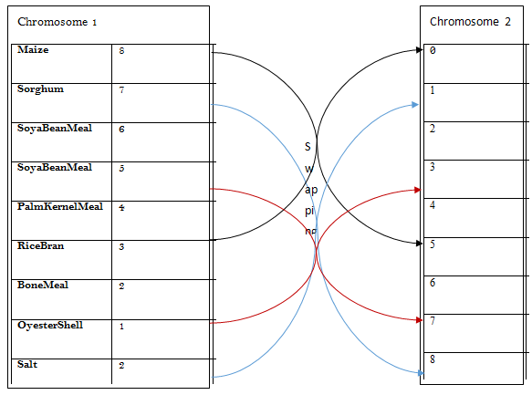 Crossover is a process in genetic algorithm where two best fit parents reproduce by donating their genes to give birth to an offspring. In this research, chromosomes are potential parents that reproduce an offspring through the use of Gene Swapper. Hence, the crossover process takes place between the chromosomes through the help of the gene swapper which swaps genes’ positions between the chromosomes by several moves. This process is optimized to give the best output with the aid of Tabu Search optimizer that look ahead to the nearest neighbour of the initial swapped genes and quickly compute the fitness function and then match with previous if fitter. TS reduces the number of moves the gene swapper makes by performing permutation of best possible gene swap arrangement and picking the least cost price. It also conserves time spent during the crossover. Several swapping moves are made until the fittest offspring is produced. One of such swapping move is depicted in Figure 3.