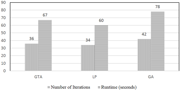 The results presented in Table 11 also reveals that the number of iterations and runtime for generating the optimal solution for TAM was lower than that of GA and but higher for LP. Usually, the smaller the number of iterations and the runtime the more efficient is the algorithm. The major motivation for hybridizing GA with Tabu Search to produce TAM in this paper was to enhance the speed of the GA algorithm. The result in Table 11 clearly shows that introducing a local search algorithm (Tabu search) has succeeded in increasing the speed of generating the optimal solution of producing a balanced feed at the least cost. The result is also presented in a graphical form in Figure 9.