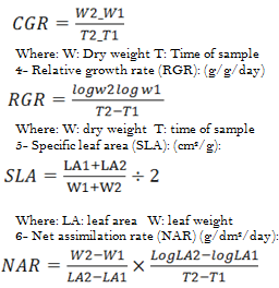 1- Leaf area (LA): Leaves from one plant were collected and their area was measured by the leaf area meter (Model AM 101.001). Then, these leaves and the leaves of the all sampled plants were dried and weighed. Using area to weight ratio, the total leaf area was calculated and then leaf area index was determined.