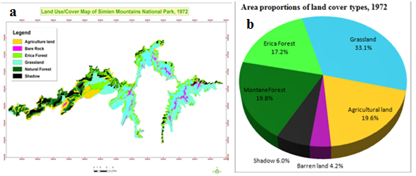 The land use types of SMNP derived from the maps of 1972, 1994 and 2017 were described as montane forest, Erica forest, grassland, agriculture, barren land and shadow. Based on their increasing order of percent coverage, the land use types for the year 1972 were barren land, shadow, Erica forest, agricultural land, montane forest, and grassland.